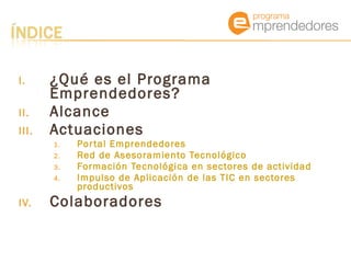 El Programa Emprendedores tiene como objetivo fomentar la incorporación de las TIC en las micropymes y autónomos de Castilla y León. Sus actuaciones principales incluyen el Portal Emprendedores, formación tecnológica, una red de asesoramiento tecnológico y el impulso de aplicaciones TIC en sectores productivos a través de desayunos de trabajo, talleres y publicaciones. El programa busca que las empresas reconozcan los beneficios de las TIC y facilitar su implantación mediante diagnósticos y asesoramiento.