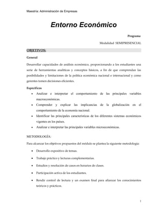 Este documento presenta la maestría en administración de empresas de una universidad, incluyendo objetivos, metodología, contenidos mínimos, criterios de evaluación y bibliografía. El programa se enfoca en desarrollar capacidades de análisis económico para que los estudiantes comprendan la política económica y tomen decisiones eficientes como gerentes. Los contenidos cubren temas de microeconomía, macroeconomía, oferta y demanda agregada, y crecimiento económico. La metodología incluye clases expositivas, lect