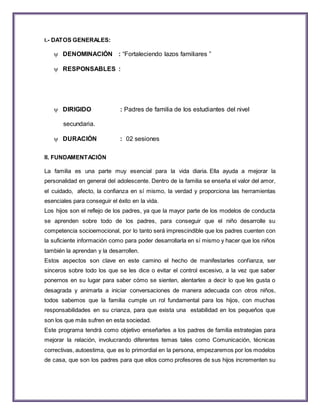 Este documento presenta dos talleres dirigidos a padres de familia sobre el fortalecimiento de lazos familiares. El primer taller se titula "Necesito amarme para amar a los demás" y trata sobre la autoestima. El segundo taller se llama "Aprendiendo a comunicarnos en familia" y cubre temas como la comunicación efectiva. Cada taller incluye actividades como dinámicas grupales, presentaciones y discusiones con el objetivo de enseñar a los padres estrategias para mejorar las relaciones familiares.