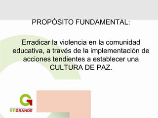 El documento presenta el Programa de Valores por una Convivencia Escolar Armónica de la Secretaría de Educación del Estado de México, cuyo objetivo es prevenir y atender el bullying y otros tipos de violencia escolar para promover una mejor formación de los estudiantes basada en valores, derechos humanos y diversidad cultural. El programa opera a través de redes interinstitucionales, académicas, de docentes, estudiantes y familias para lograr una cultura de paz en las escuelas.