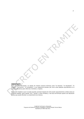 Este documento presenta un programa de estudio de Historia, Geografía y Ciencias Sociales para tercero básico. Incluye una introducción sobre el objetivo de los programas de estudio de apoyar el logro de los objetivos de aprendizaje, así como nociones básicas sobre estos objetivos y orientaciones para la implementación del programa. Luego presenta el índice y contenidos del programa, organizado en unidades para cada semestre.