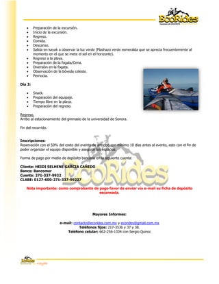 Este documento describe una excursión en kayak de un fin de semana para conocer la técnica básica de paleo y navegar por la costa sonorense. Incluye transporte, comidas, equipo, tiendas de campaña y guía. El programa incluye instalación del campamento, cena, desayuno, instrucción de kayak, excursión, comida, observación de la puesta de sol en kayak y fogatas. El costo es de $1,735 pesos y se realiza en la playa El Colorado a 1 hora y media de Hermosillo.