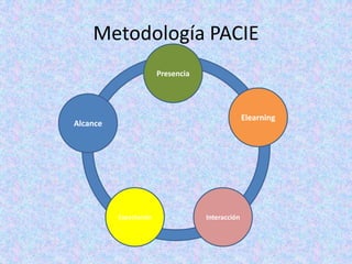 La metodología PACIE es un método de aprendizaje en línea basado en herramientas web 2.0 y aulas virtuales. Se divide en tres secciones: bloque cero, académico y cierre. El bloque cero contiene información sobre la gestión del curso, comunicación entre estudiantes y tutor, e interacción social. Proporciona detalles sobre el curso, evaluaciones, y fomenta el apoyo entre los estudiantes. La metodología PACIE busca hacer la educación más accesible a través de la tecnolog