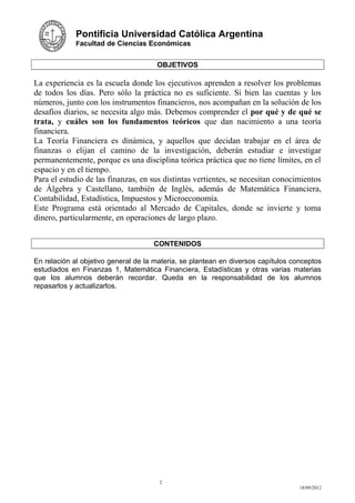 Este documento presenta la materia Finanzas II que se dicta en la Facultad de Ciencias Económicas de la Pontificia Universidad Católica Argentina. El curso se dicta para el 4to año de la carrera de Licenciatura en Administración de Empresas. El programa abarca temas como las fuentes de financiamiento, la determinación de tasas de interés, el mercado de bonos, la incertidumbre y el retorno, entre otros. El objetivo del curso es que los estudiantes comprendan los fundamentos teóricos de la te