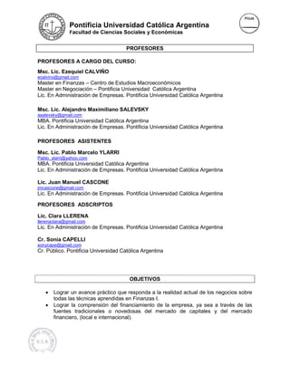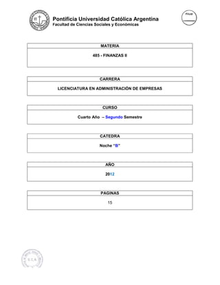 Este documento presenta el plan de estudios para la materia Finanzas II de la carrera de Licenciatura en Administración de Empresas en la Pontificia Universidad Católica Argentina. El plan consta de 10 unidades que cubren temas como tasas de interés, mercados de capitales, finanzas internacionales, bonos, riesgo, decisiones de financiamiento, estructura de capital y derivados. Los objetivos son lograr un avance práctico en estas áreas y la comprensión de su impacto en la valuación y financiamiento de empresas.