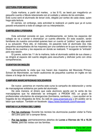 La Feria del Libro "Gloria Fuertes" se celebrará del 18 al 22 de abril en el Centro. Incluirá actividades como cuentacuentos, una presentación de un mercadillo de libros en la biblioteca, lecturas por megafonía relacionadas con los animales, una cartelera literaria donde familiares leerán cuentos, cuentos en inglés a cargo de maestros británicos, y una campaña de marcapáginas cuya recaudación irá a una ONG que ayuda a refugiados sirios. Las visitas ser