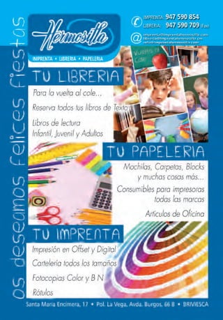 Este documento es el pregón de las fiestas patronales de Briviesca pronunciado por Soledad Núñez Ramos. En él, expresa su orgullo por sus lazos familiares con Briviesca a través de su abuelo y otros parientes. También alaba las características de la ciudad como su ubicación rodeada de campos y montes, su diseño urbano ortogonal que data del siglo XIV, y su encanto derivado de elementos como los gigantes, cabezudos y el templete de música de la plaza mayor.