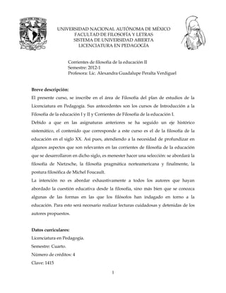 Este documento presenta la descripción del curso "Corrientes de filosofía de la educación II" impartido en la Facultad de Filosofía y Letras de la UNAM. El curso analiza las corrientes de filosofía de la educación del siglo XX, incluyendo las filosofías de Nietzsche, el pragmatismo estadounidense y Michel Foucault. Los objetivos son que los estudiantes comprendan la perspectiva filosófica de la educación en el siglo XX, evalúen críticamente los planteamientos filos