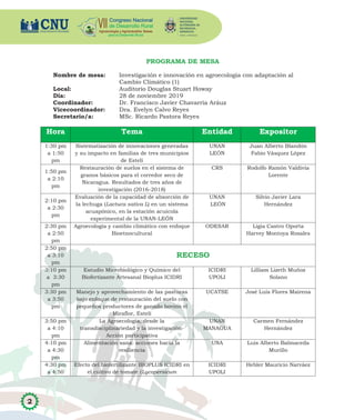 El documento presenta el programa del VII Congreso Nacional de Desarrollo Rural 2019 que se llevará a cabo los días 28 y 29 de noviembre en la UNAN-Managua. Incluye cinco mesas de investigación e innovación en agroecología con adaptación al cambio climático, una mesa sobre formación para el desarrollo de la agroecología y una mesa sobre experiencias agroecológicas. Cada mesa contará con expositores de diferentes universidades e instituciones que compartirán sus investigaciones y proyectos relacionados con la agroecología.