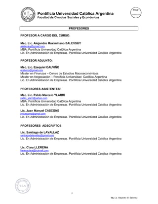 Este documento presenta los objetivos y contenidos de la materia 485 - Finanzas II de la Licenciatura en Administración de Empresas de la Pontificia Universidad Católica Argentina. El curso abarca 10 capítulos sobre temas financieros como tasas de interés, mercados de capitales, finanzas internacionales, bonos, riesgo, decisiones de financiamiento, estructura de capital, derivados y valuación de empresas. Los profesores a cargo son Alejandro Salevsky, Ezequiel Calviño y otros. El objetivo es brindar her