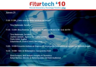 Este documento presenta la agenda de Fiturtech 2010, un evento que tuvo lugar del 20 al 23 de mayo. La agenda incluye presentaciones, mesas redondas y talleres sobre temas como geolocalización, realidad aumentada, marketing de video y web, análisis web, y storytelling para el turismo. Los oradores representan a empresas y organizaciones relacionadas con el turismo tecnológico en España.