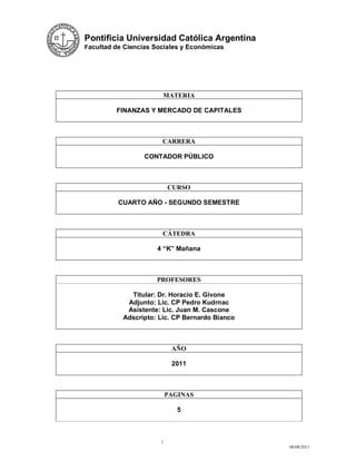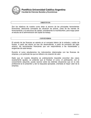 Este documento presenta el programa de estudio para la asignatura Finanzas y Mercado de Capitales, parte del plan de estudios de la carrera de Contador Público en la Pontificia Universidad Católica Argentina. El programa incluye once capítulos que cubren temas como valuación de activos, gestión del riesgo, flujo de fondos, presupuestación de capital, estructura de capital, valuación de empresas y mercados financieros. El objetivo del curso es proporcionar las herramientas financieras necesarias para tomar decisiones orientadas a