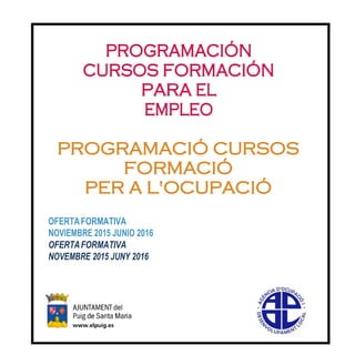 Este documento presenta la oferta formativa de cursos y talleres gratuitos o a bajo coste sobre diferentes temas como inglés, informática, redacción de currículums, carnet de carretillas elevadoras, entre otros. Se detallan los niveles y horarios de cada curso, así como el lugar y plazo de inscripción requerido. Además, se informa sobre cursos disponibles de forma continua a lo largo del año sobre manipulación de alimentos y del programa Aula Mentor.