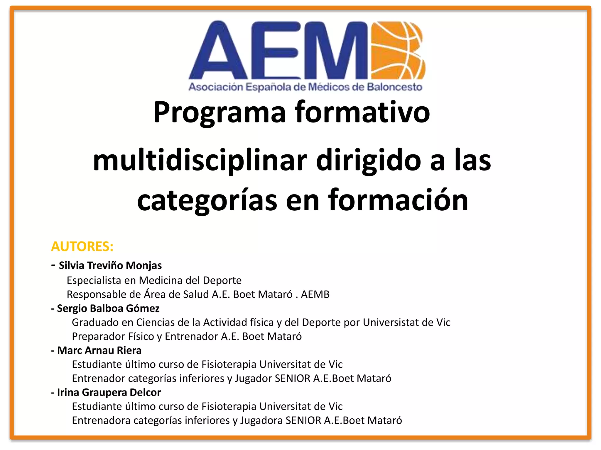 Este documento presenta un programa formativo multidisciplinar para categorías en formación, centrado en el calentamiento, la propiocepción de tobillo y la higiene del deportista, dirigido por expertos en medicina del deporte y actividad física. Se detalla la importancia de un calentamiento estructurado para preparar físicamente a los jugadores y prevenir lesiones, así como ejercicios propioceptivos y recomendaciones sobre el calzado y vestimenta adecuada. También se abordan consideraciones específicas para evitar lesiones comunes en el baloncesto durante el entrenamiento.