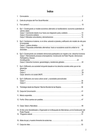 Este documento presenta el programa de actividades para el Foro Social Mundial Temático que se llevará a cabo del 2 al 4 de mayo de 2010 en el Zócalo de la Ciudad de México. El foro contará con paneles, debates, talleres y actividades culturales organizadas en torno a cinco ejes temáticos relacionados con la construcción de alternativas al neoliberalismo y al capitalismo. El objetivo del foro es mostrar cómo los pueblos ya están construyendo "otro mundo posible" a través de experiencias y prácticas altern