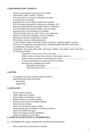Este documento presenta un programa general de intervención logopédica dividido en dos áreas principales: preverbal y bases anatómico-funcionales. El área preverbal incluye actividades para desarrollar la atención, percepción, discriminación auditiva, ritmo, imitación y comunicación gestual antes de la adquisición del lenguaje. El área de bases anatómico-funcionales se enfoca en relajación, respiración, movilidad de órganos fonadores para preparar al paciente para la emisión vocal.