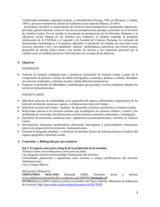 Este documento presenta la asignatura Geografía de América Latina dictada en la Universidad Nacional de La Pampa. Incluye la fundamentación teórica, los objetivos generales y particulares, y los contenidos organizados en tres ejes temáticos: 1) El espacio como parte integral de la producción social, 2) Configuración y dinámica de los territorios latinoamericanos a través del tiempo, y 3) Problemáticas territoriales contemporáneas. El enfoque es analizar los territorios latinoamericanos considerando procesos sociales, polí