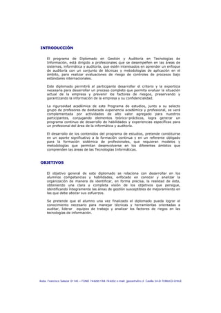 Este documento presenta la información sobre un diplomado en gestión y auditoría en tecnologías de la información. El diplomado consta de 136 horas divididas en 7 módulos que cubren temas como inteligencia de negocios, gestión de proyectos TIC, fundamentos de auditoría informática, ingeniería de software, modelos para la gestión de servicios TIC y otros. El objetivo es desarrollar las habilidades necesarias para auditar, liderar equipos y analizar riesgos en tecnologías de la información.