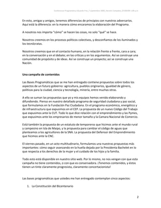 El documento presenta el discurso de Eduardo Frei Ruiz-Tagle al entregar las Bases Programáticas de su candidatura presidencial. Frei destaca que el programa fue elaborado de forma participativa con aportes de diversos sectores a lo largo de Chile. Asimismo, señala los cinco ejes en torno a los cuales se organizará la acción de gobierno: la Constitución del Bicentenario, el Nuevo Trato entre el Estado y los Ciudadanos, los Nuevos Derechos Sociales y Económicos, la Nue
