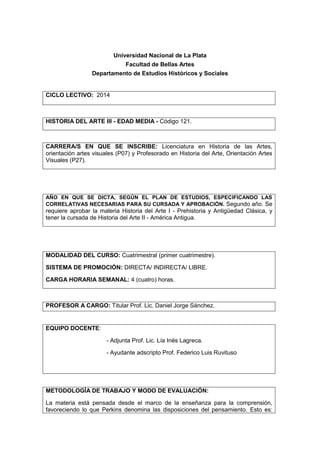 Este documento presenta la descripción de la materia Historia del Arte III - Edad Media, dictada en la Universidad Nacional de La Plata. La materia se enfoca en el período entre los siglos III y XIV d.C. y analiza el arte a través de ejes conceptuales como la iconografía y el estilo. Los contenidos se dividen en cuatro bloques que cubren el nacimiento del arte medieval, las invasiones islámicas y vikingas, el monaquismo románico y gótico, y la emergencia de lo laico. La materia
