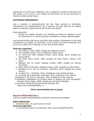 Este documento presenta el programa del curso "Humanidades II" en la Universidad Tecnológica de Pereira. El curso busca que los estudiantes desarrollen una comprensión crítica de sí mismos como sujetos históricos y de su capacidad de transformar su realidad. Se abordarán tres núcleos problémicos relacionados con la construcción de la conciencia de la realidad, las relaciones con los otros, y romper con la naturalización de la ceguera. La metodología incluye discusión teórica, aná