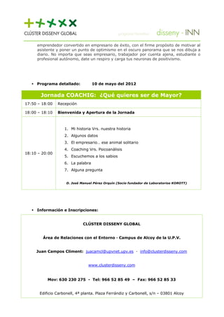 Este documento anuncia la segunda jornada de coaching organizada por el Clúster Disseny Global. La jornada tendrá lugar el 10 de mayo de 2012 y contará con la presentación de José Manuel Pérez Orquín, fundador de Laboratorios KOROTT, sobre su historia empresarial y el coaching. Los asistentes podrán inscribirse pagando cuotas de 0 a 50 euros dependiendo de su perfil, y recibirán un certificado del Clúster Disseny Global.