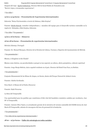 El V Congreso Internacional de Turismo Rural, celebrado en febrero de 2012, abordó la gestión de recursos culturales y la influencia de las redes sociales en el turismo. Incluyó ponencias y mesas redondas de expertos que presentaron experiencias internacionales y estrategias en gastronomía y marketing digital. El evento finalizó con conclusiones sobre el turismo cultural y la promoción sostenible en este sector.