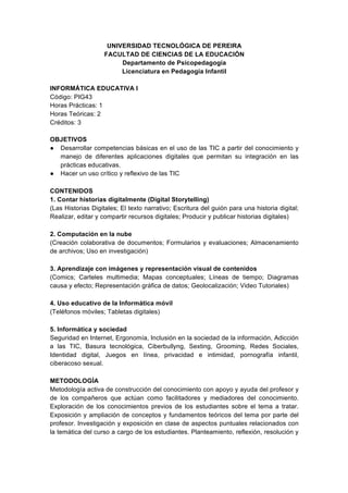 Este documento presenta la descripción de un curso de Informática Educativa I que busca desarrollar competencias en el uso de las TIC y su integración en prácticas educativas. El curso cubre temas como el storytelling digital, la computación en la nube, el aprendizaje con imágenes y la informática móvil. Se empleará una metodología activa centrada en el estudiante que incluye proyectos, trabajo individual y en grupo utilizando herramientas digitales. La evaluación consta de tres pruebas parciales