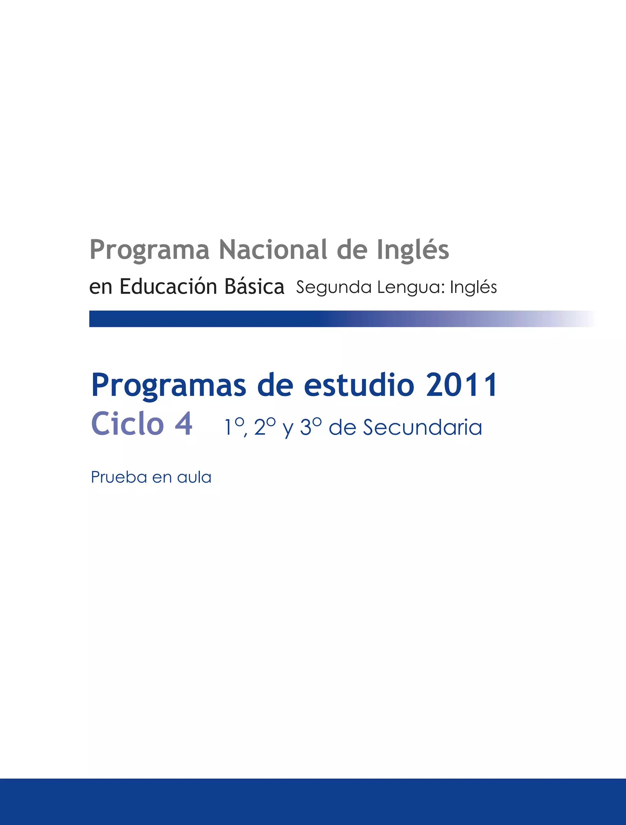 Este documento presenta el programa de estudio de Inglés para el ciclo 4 de educación secundaria (1o, 2o y 3o grado) en México. El programa fue desarrollado como parte del Programa Nacional de Inglés en Educación Básica con el objetivo de mejorar la calidad de la educación y preparar a los estudiantes para el mundo globalizado del siglo XXI. El programa sigue un enfoque basado en competencias y será implementado gradualmente a través de etapas de prueba y expansión.