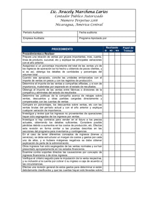 Este documento presenta el programa para la revisión de ingresos de una auditoría. El objetivo es revisar y evaluar el control interno sobre los ingresos y determinar si los ingresos, costos y gastos registrados corresponden al período auditado y si el estado de resultados presenta razonablemente los resultados de acuerdo con los principios de contabilidad. El programa describe los procedimientos de pruebas de cumplimiento y sustantivas a realizar, como preparar sumarios de cuentas, analizar políticas de ventas, revisar documentación de soporte, e investig