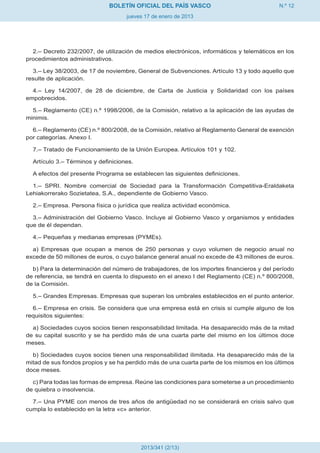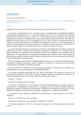 El boletín oficial del País Vasco del 17 de enero de 2013 anuncia la aprobación de la normativa para el programa +innova, que busca fortalecer la competitividad e innovación de las empresas vascas. Este programa, administrado por SPRI, incluye el establecimiento de itinerarios de competitividad e innovación con diversas fases y subprogramas de apoyo, destinados especialmente a pequeñas y medianas empresas (pymes). Las condiciones, requisitos y procedimientos para acceder a estas ayudas han sido detallados en la normativa publicada.