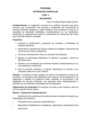 Este documento presenta un programa de integración curricular para secundaria que busca promover el aprendizaje interdisciplinario a través de proyectos. El programa se divide en tres módulos de tres meses cada uno, comenzando con la exploración de conexiones entre disciplinas y terminando con la aplicación de conocimientos a problemas reales. Los proyectos involucran temas elegidos por los estudiantes y abordan problemas sociales, científicos y matemáticos de manera colaborativa e interdisciplinaria. El enfoque es desarrollar hab