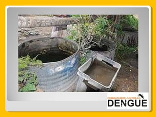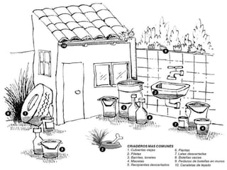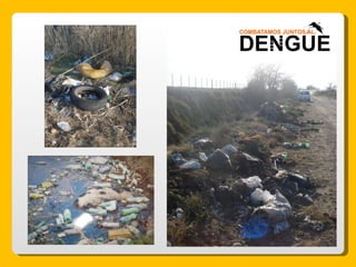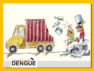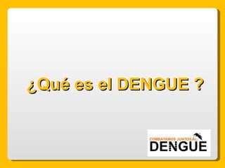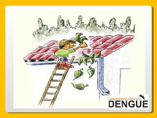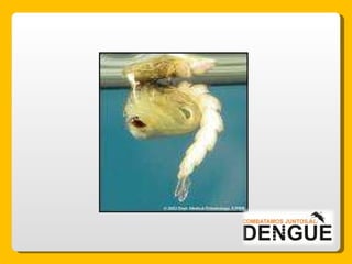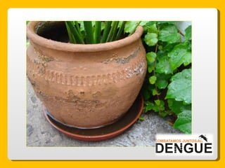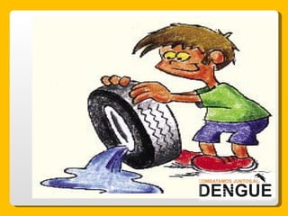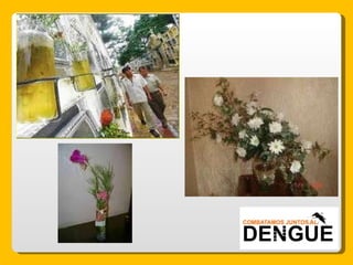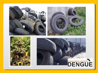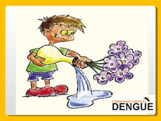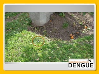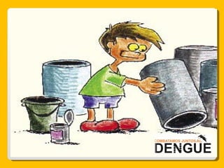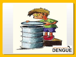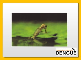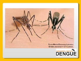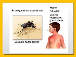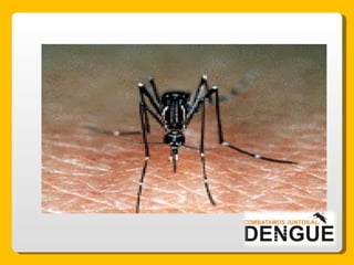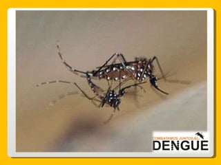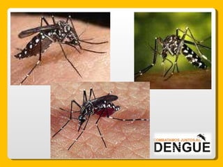 El documento proporciona información sobre el dengue y el mosquito Aedes aegypti y Aedes albopictus que lo transmite. Explica que el dengue es una enfermedad viral transmitida por la picadura de estos mosquitos, que puede presentarse de forma clásica o hemorrágica. No existe vacuna por lo que la prevención consiste en eliminar los criaderos de mosquitos y usar repelente e insecticida. El tratamiento es sintomático y es importante acudir al centro de salud ante los síntomas.