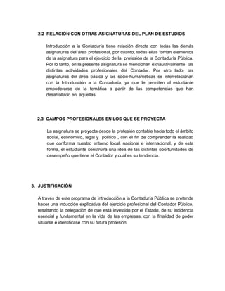 Este documento describe el curso de Introducción a la Contaduría de la Universidad del Atlántico. Presenta la identificación del curso, sus objetivos generales y específicos, contenidos, estrategias pedagógicas y de evaluación. El curso busca que los estudiantes comprendan los conceptos básicos de la contaduría pública y su importancia social. Se dividirá en 4 unidades sobre el contador público, sistema de información contable, empresa y principios contables.