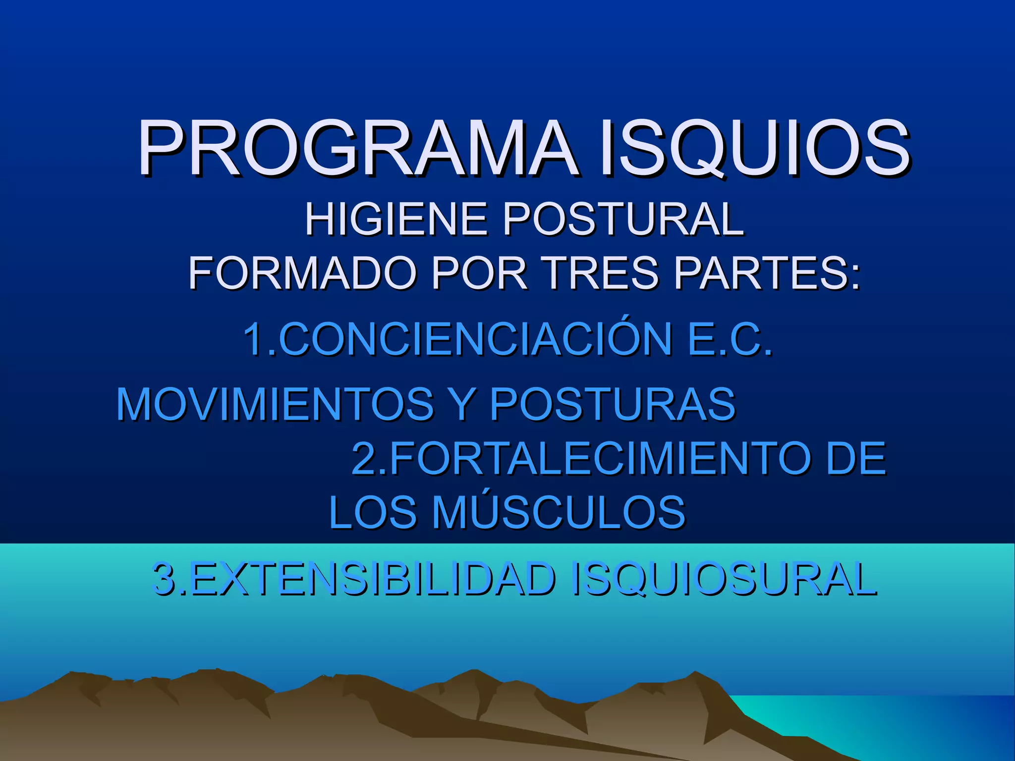 Este documento describe un programa de higiene postural dividido en tres partes: 1) concienciación sobre movimientos y posturas, 2) fortalecimiento muscular, especialmente de la espalda baja y abdomen, y 3) extensibilidad de los músculos isquiosurales. Explica la importancia de mantener una buena postura cuando estamos sentados durante largos períodos, y proporciona ejercicios para fortalecer los músculos relevantes y prevenir dolores de espalda.