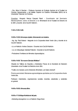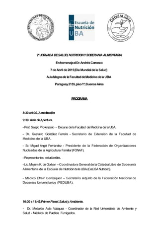 La jornada tratará temas de salud, nutrición y soberanía alimentaria en homenaje al Dr. Andrés Carrasco. Contará con paneles sobre salud y ambiente, nutrición en Argentina, inocuidad de los alimentos y stands de productores agroecológicos. Habrá charlas, talleres, degustación de alimentos y cierre musical. La jornada es gratuita y abierta a estudiantes, graduados, docentes y la comunidad.