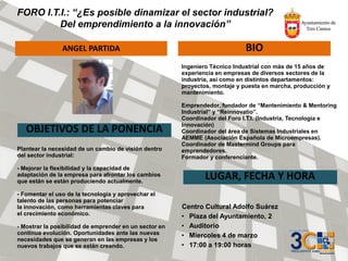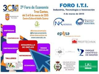 El foro i.t.i. del 4 de marzo de 2015 se centra en la dinámica del sector industrial, abordando la necesidad de mejorar la flexibilidad empresarial, fomentar la innovación mediante tecnología y explorar nuevas oportunidades de emprendimiento. Se presentan distintas ponencias sobre los beneficios de la tecnología en empresas y la importancia de una colaboración efectiva entre universidad y sector empresarial para impulsar la investigación y desarrollo. La mesa redonda discute la colaboración entre estos actores como clave para la evolución y creación de nuevos productos.