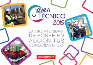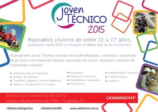 El documento anuncia el Programa Joven Técnico de Odebrecht para 2015, el cual busca identificar, seleccionar y desarrollar jóvenes recién graduados de carreras técnicas como Electrónica, Mantenimiento Industrial, Mecatrónica, Administración de Empresas, Análisis de Sistemas, Seguridad e Higiene Ambiental, y Logística con edades entre 22 a 27 años. Los interesados deben enviar su CV antes del 30 de junio a empleos@odebrecht.com indicando "Programa