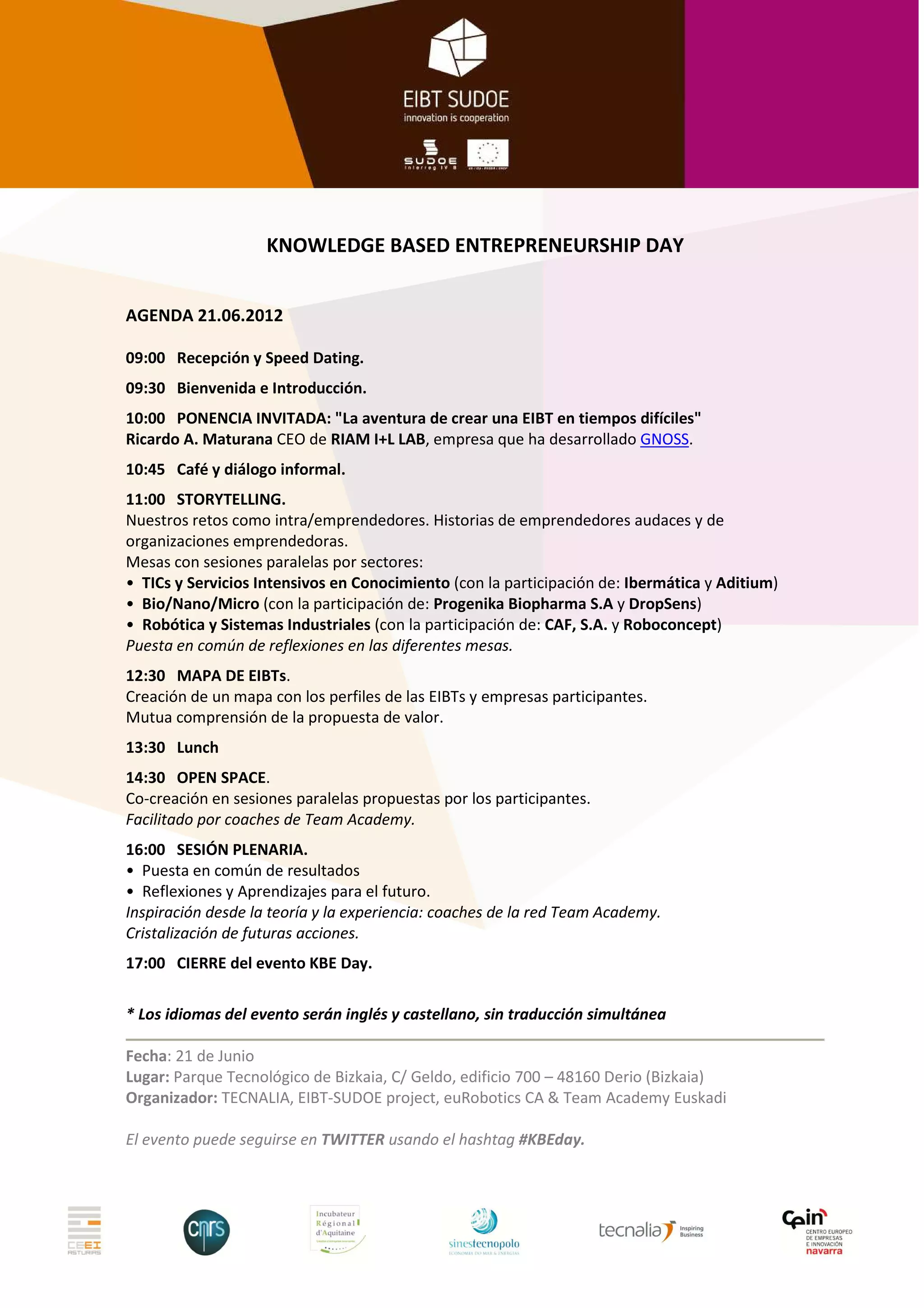El 21 de junio de 2012 se llevó a cabo el 'Knowledge Based Entrepreneurship Day' en el Parque Tecnológico de Bizkaia, con actividades que incluyeron ponencias, mesas paralelas y sesiones de co-creación. Ricardo A. Maturana, CEO de riam i+l lab, fue uno de los ponentes resaltando la creación de empresas en tiempos difíciles. La jornada promovió el intercambio de experiencias y la creación de un mapa de empresas de base tecnológica participantes en el evento.