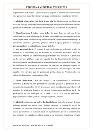 Este documento presenta las propuestas del partido Ciudadanos para reformar la administración pública en Avilés. Propone mayor transparencia, eficiencia y participación ciudadana, así como limitar los mandatos políticos, publicar declaraciones de patrimonio y separar de cargos a imputados por corrupción. También aboga por simplificar niveles administrativos, dar más autonomía a municipios y nueva financiación local.
