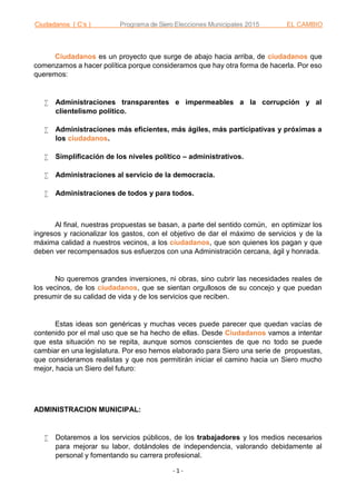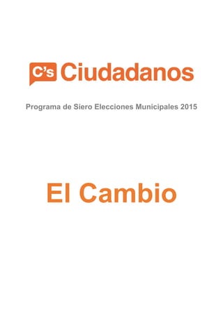 Este documento presenta el programa electoral de Ciudadanos para las elecciones municipales de 2015 en Siero. Propone una administración más transparente, eficiente y participativa que preste servicios de calidad a los ciudadanos. Entre sus propuestas se incluyen mejorar los servicios públicos, aumentar la policía local, reducir la deuda municipal, fomentar la economía local, proteger el medio ambiente, y prestar apoyo a los más necesitados. El objetivo final es mejorar la calidad de vida de los vecinos de Siero.