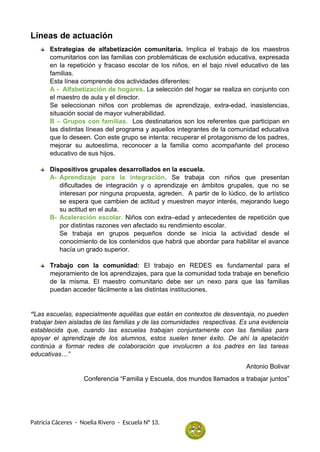 El Programa Maestros Comunitarios se implementó en 2005 para mejorar la retención escolar, los aprendizajes y atender a la diversidad de estudiantes. Los maestros comunitarios trabajan en duplas y equipos para personalizar la enseñanza, extender el tiempo pedagógico y crear un aula expandida en la escuela y la comunidad. El programa busca una escuela democrática donde todos los actores participen en los cambios educativos.