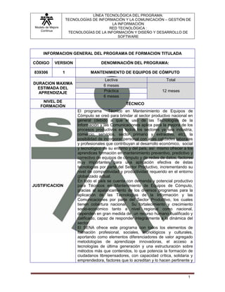 Este documento presenta la información general del programa de formación técnica en Mantenimiento de Equipos de Cómputo. El programa dura un máximo de 12 meses y busca brindar capacitación técnica en mantenimiento preventivo, predictivo y correctivo de equipos de cómputo y redes de datos para apoyar el desarrollo tecnológico y productivo del país. El programa desarrolla competencias relacionadas con el mantenimiento de equipos de cómputo y cuenta con contenidos curriculares sobre hardware, software, diagnóstico y reparación de