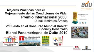 Este documento describe el Programa de Mejoramiento Integral de Barrios de la ciudad de Medellín. El objetivo del programa es planificar, diseñar y ejecutar proyectos de vivienda y mejoramiento de barrios para contribuir al desarrollo urbano de la ciudad, incluyendo la construcción y mejoramiento de viviendas, generación de espacios públicos seguros, y proyectos de reasentamiento e infraestructura. El documento también presenta el caso específico del mejoramiento del barrio Quebrada Juan Bobo como parte de este programa.