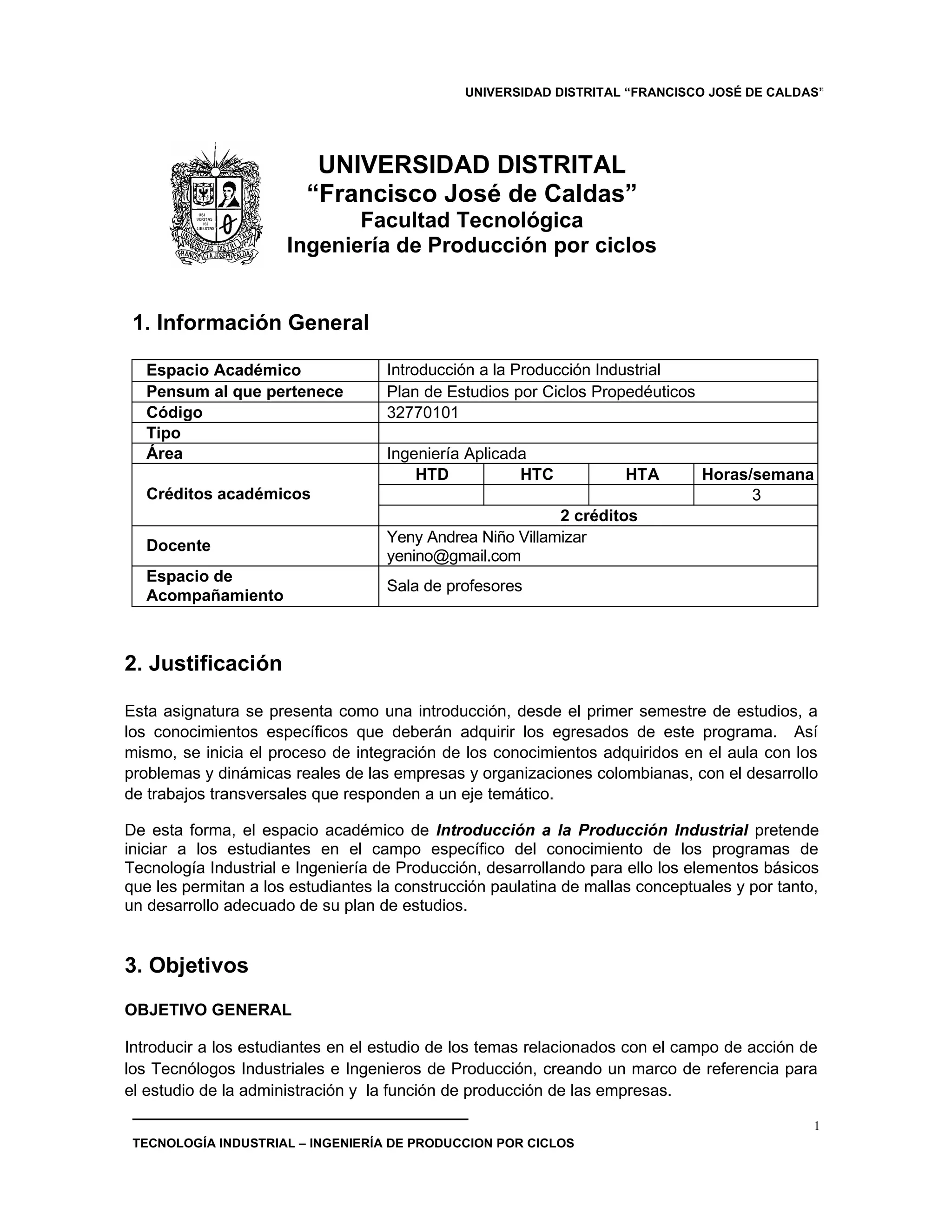 Este documento presenta la asignatura Introducción a la Producción Industrial de la Universidad Distrital Francisco José de Caldas. El objetivo general es introducir a los estudiantes a los temas relacionados con la producción industrial. Se describen los objetivos específicos, requerimientos, créditos, competencias, estrategias de evaluación, metodología y bibliografía de referencia.