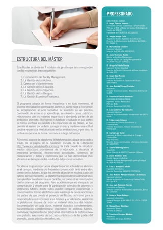 Este documento presenta la estructura de un Master en Gestión de Activos Inmobiliarios y Servicios. El máster consta de 7 módulos sobre diferentes áreas de gestión como gestión de activos, operación y mantenimiento, gestión de espacios y gestión económico-financiera. Evalúa de forma continua a los estudiantes a través de casos prácticos y un proyecto tutelado. También utiliza una plataforma de teleformación con material didáctico y herramientas de comunicación. El máster está dirigido por