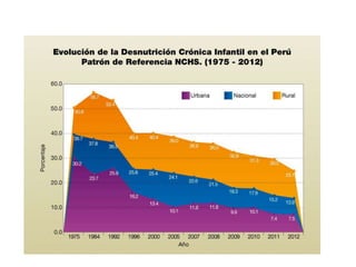 El documento proporciona información sobre el hambre y la desnutrición a nivel mundial y en América Latina. Menciona que 870 millones de personas en el mundo no tienen suficiente comida y que la desnutrición infantil sigue siendo un problema importante en países como Perú, donde aproximadamente el 19% de los niños menores de 5 años sufren desnutrición crónica. También destaca los esfuerzos del gobierno peruano para reducir las tasas de desnutrición infantil en los últimos años.