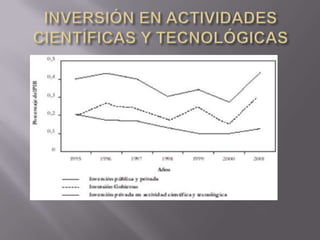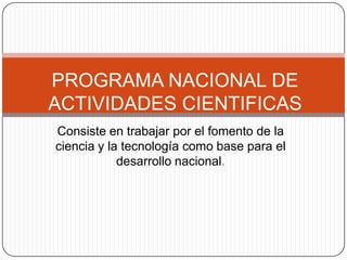 El documento habla sobre el fomento de la ciencia y la tecnología como base para el desarrollo nacional a través de un programa nacional de actividades científicas e inversiones en actividades científicas y tecnológicas. También explica que los indicadores de ciencia y tecnología son unidades de medida numéricas que permiten evaluar el estado actual y comportamiento de un sistema a lo largo del tiempo.