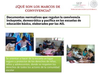 El documento describe un programa nacional para promover la convivencia escolar en México a través de varias iniciativas como marcos locales de convivencia, redes de apoyo a las escuelas, capacitación de maestros y autoridades educativas, y proyectos para fomentar la inclusión y la equidad.