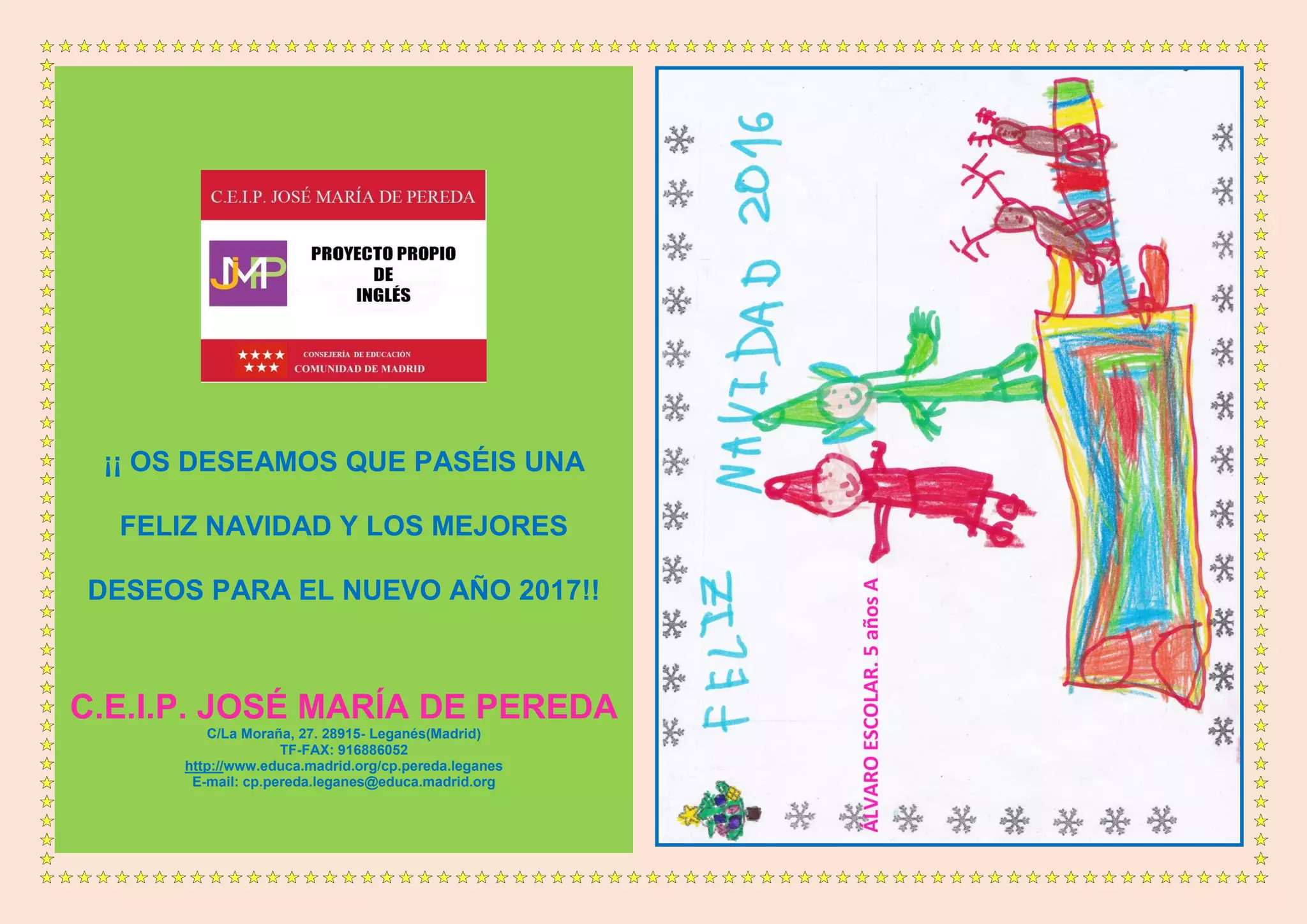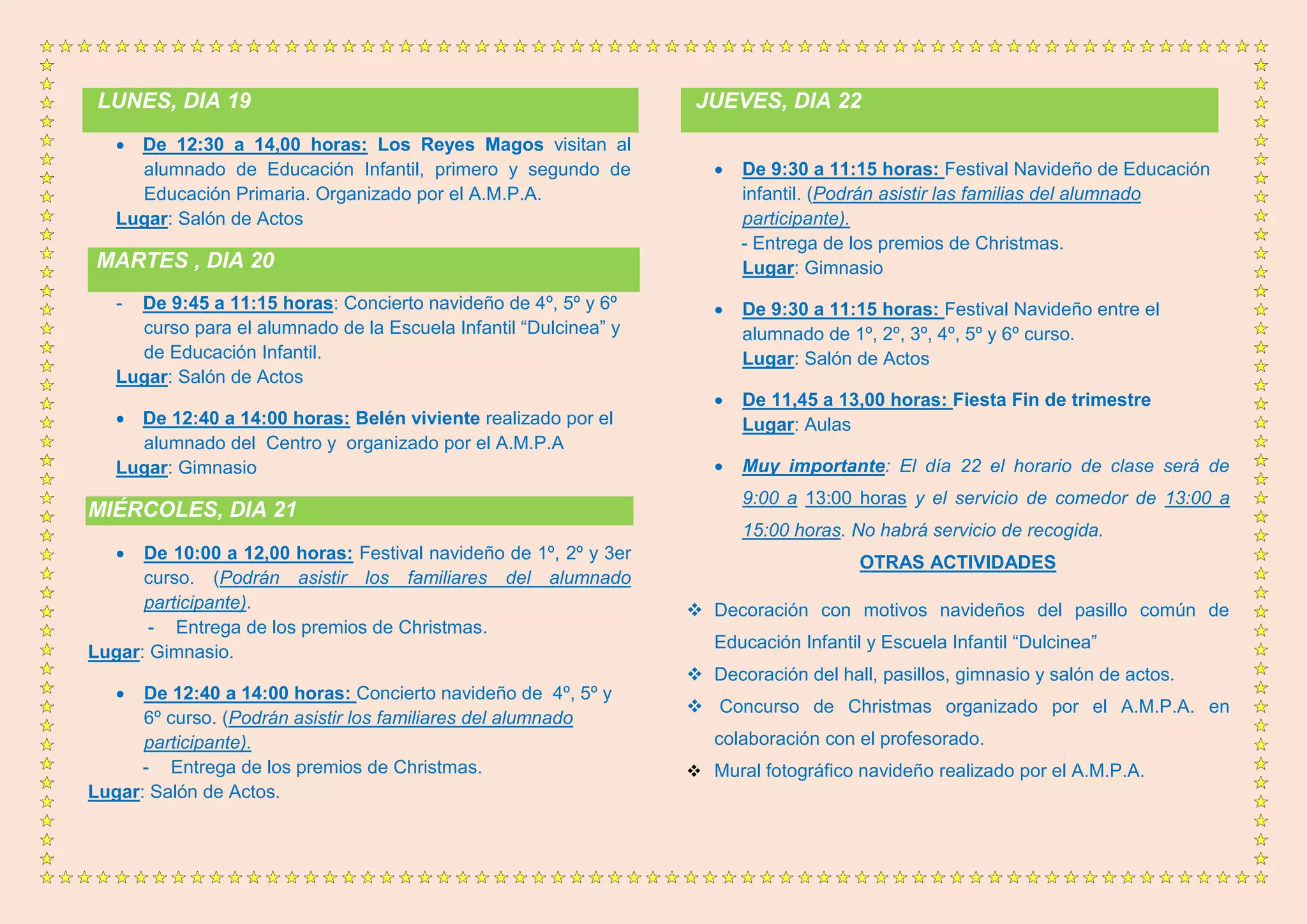El documento presenta la agenda navideña de actividades para la semana del 19 al 22 de diciembre en el Colegio José María de Pereda en Leganés, Madrid. Incluye conciertos navideños, un belén viviente, festivales navideños para diferentes cursos, entrega de premios y una fiesta de fin de trimestre el jueves 22. También menciona otras decoraciones y actividades navideñas como un concurso y un mural fotográfico organizados por el AMPA.
